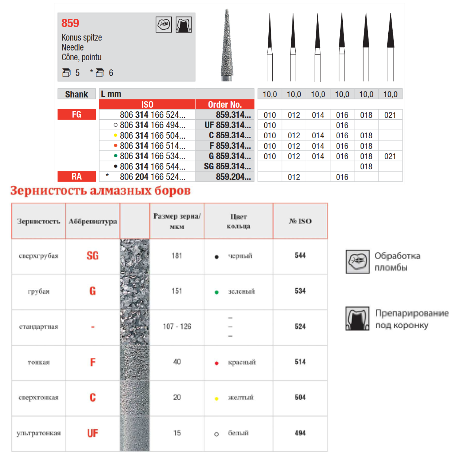 Бор турбинный алмазный 859 FG конус 1,4-2,1 мм: 859.314.014, 859.314.016, 859.314.018, 859.314.021